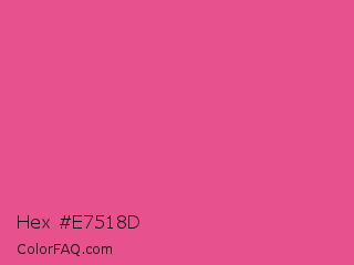 Hex #e7518d Color is a light rose color and the nearest color is Fandango Pink #de5285. Hex code #e7518d and RGB value is rgb(231,81,141). In RGB color space, this color is composed of 91% red, 32% green, 55% blue, In CMYK color space, this color is composed of 0% cyan, 65% magenta, 39% yellow , 9% black , In HSL color space, this color has a hue angle of 336° , 76% saturation and 61% lightness.
