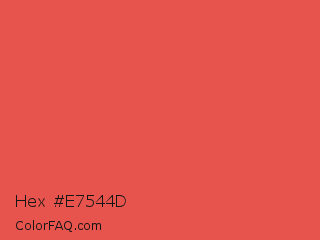 Hex #e7544d Color is a normal red color and the nearest color is Carmine Pink #eb4c42. Hex code #e7544d and RGB value is rgb(231,84,77). In RGB color space, this color is composed of 91% red, 33% green, 30% blue, In CMYK color space, this color is composed of 0% cyan, 64% magenta, 67% yellow , 9% black , In HSL color space, this color has a hue angle of 3° , 76% saturation and 60% lightness.