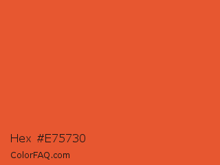 Hex #e75730 Color is a normal red color and the nearest color is Flamingo #f2552a. Hex code #e75730 and RGB value is rgb(231,87,48). In RGB color space, this color is composed of 91% red, 34% green, 19% blue, In CMYK color space, this color is composed of 0% cyan, 62% magenta, 79% yellow , 9% black , In HSL color space, this color has a hue angle of 13° , 79% saturation and 55% lightness.