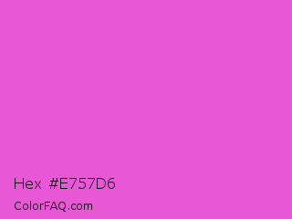 Hex #e757d6 Color is a light magenta color and the nearest color is Purple Pizzazz #fe4eda. Hex code #e757d6 and RGB value is rgb(231,87,214). In RGB color space, this color is composed of 91% red, 34% green, 84% blue, In CMYK color space, this color is composed of 0% cyan, 62% magenta, 7% yellow , 9% black , In HSL color space, this color has a hue angle of 307° , 75% saturation and 62% lightness.
