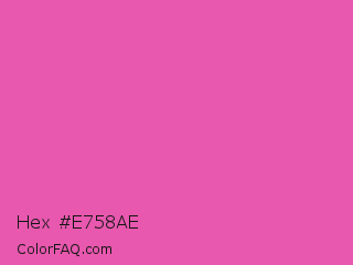 Hex #e758ae Color is a light magenta color and the nearest color is Brilliant Rose #f653a6. Hex code #e758ae and RGB value is rgb(231,88,174). In RGB color space, this color is composed of 91% red, 35% green, 68% blue, In CMYK color space, this color is composed of 0% cyan, 62% magenta, 25% yellow , 9% black , In HSL color space, this color has a hue angle of 324° , 75% saturation and 63% lightness.