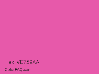 Hex #e759aa Color is a light magenta color and the nearest color is Brilliant Rose #f653a6. Hex code #e759aa and RGB value is rgb(231,89,170). In RGB color space, this color is composed of 91% red, 35% green, 67% blue, In CMYK color space, this color is composed of 0% cyan, 61% magenta, 26% yellow , 9% black , In HSL color space, this color has a hue angle of 326° , 75% saturation and 63% lightness.