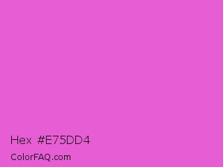 Hex #e75dd4 Color is a light magenta color and the nearest color is Orchid #da70d6. Hex code #e75dd4 and RGB value is rgb(231,93,212). In RGB color space, this color is composed of 91% red, 36% green, 83% blue, In CMYK color space, this color is composed of 0% cyan, 60% magenta, 8% yellow , 9% black , In HSL color space, this color has a hue angle of 308° , 74% saturation and 64% lightness.