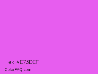 Hex #e75def Color is a light magenta color and the nearest color is Heliotrope #df73ff. Hex code #e75def and RGB value is rgb(231,93,239). In RGB color space, this color is composed of 91% red, 36% green, 94% blue, In CMYK color space, this color is composed of 3% cyan, 61% magenta, 0% yellow , 6% black , In HSL color space, this color has a hue angle of 297° , 82% saturation and 65% lightness.