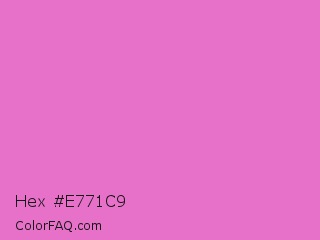 Hex #e771c9 Color is a light magenta color and the nearest color is Orchid #da70d6. Hex code #e771c9 and RGB value is rgb(231,113,201). In RGB color space, this color is composed of 91% red, 44% green, 79% blue, In CMYK color space, this color is composed of 0% cyan, 51% magenta, 13% yellow , 9% black , In HSL color space, this color has a hue angle of 315° , 71% saturation and 67% lightness.