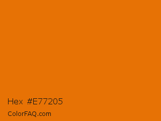 Hex #e77205 Color is a normal orange color and the nearest color is Mango Tango Crayola #e77200. Hex code #e77205 and RGB value is rgb(231,114,5). In RGB color space, this color is composed of 91% red, 45% green, 2% blue, In CMYK color space, this color is composed of 0% cyan, 51% magenta, 98% yellow , 9% black , In HSL color space, this color has a hue angle of 29° , 96% saturation and 46% lightness.