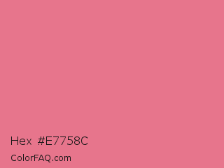 Hex #e7758c Color is a light red color and the nearest color is Bright Blush #e47698. Hex code #e7758c and RGB value is rgb(231,117,140). In RGB color space, this color is composed of 91% red, 46% green, 55% blue, In CMYK color space, this color is composed of 0% cyan, 49% magenta, 39% yellow , 9% black , In HSL color space, this color has a hue angle of 348° , 70% saturation and 68% lightness.
