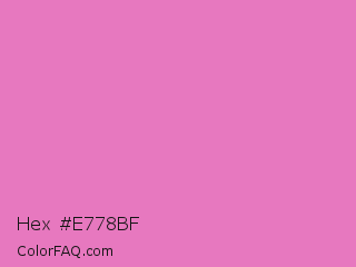 Hex #e778bf Color is a light magenta color and the nearest color is Persian Pink #f77fbe. Hex code #e778bf and RGB value is rgb(231,120,191). In RGB color space, this color is composed of 91% red, 47% green, 75% blue, In CMYK color space, this color is composed of 0% cyan, 48% magenta, 17% yellow , 9% black , In HSL color space, this color has a hue angle of 322° , 70% saturation and 69% lightness.