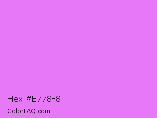 Hex #e778f8 Color is a light magenta color and the nearest color is Heliotrope #df73ff. Hex code #e778f8 and RGB value is rgb(231,120,248). In RGB color space, this color is composed of 91% red, 47% green, 97% blue, In CMYK color space, this color is composed of 7% cyan, 52% magenta, 0% yellow , 3% black , In HSL color space, this color has a hue angle of 292° , 90% saturation and 72% lightness.