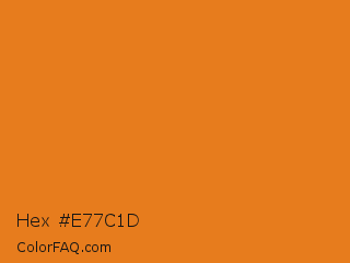 Hex #e77c1d Color is a normal orange color and the nearest color is Tango #ed7a1c. Hex code #e77c1d and RGB value is rgb(231,124,29). In RGB color space, this color is composed of 91% red, 49% green, 11% blue, In CMYK color space, this color is composed of 0% cyan, 46% magenta, 87% yellow , 9% black , In HSL color space, this color has a hue angle of 28° , 81% saturation and 51% lightness.