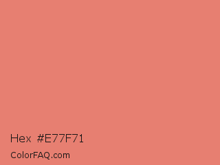 Hex #e77f71 Color is a light red color and the nearest color is Middle Red #e58e73. Hex code #e77f71 and RGB value is rgb(231,127,113). In RGB color space, this color is composed of 91% red, 50% green, 44% blue, In CMYK color space, this color is composed of 0% cyan, 45% magenta, 51% yellow , 9% black , In HSL color space, this color has a hue angle of 7° , 71% saturation and 67% lightness.