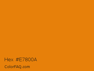 Hex #e7800a Color is a normal orange color and the nearest color is Tahiti Gold #e97c07. Hex code #e7800a and RGB value is rgb(231,128,10). In RGB color space, this color is composed of 91% red, 50% green, 4% blue, In CMYK color space, this color is composed of 0% cyan, 45% magenta, 96% yellow , 9% black , In HSL color space, this color has a hue angle of 32° , 92% saturation and 47% lightness.