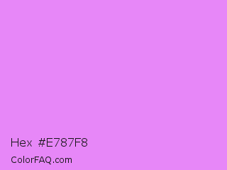 Hex #e787f8 Color is a light purple color and the nearest color is Lavender Magenta #ee82ee. Hex code #e787f8 and RGB value is rgb(231,135,248). In RGB color space, this color is composed of 91% red, 53% green, 97% blue, In CMYK color space, this color is composed of 7% cyan, 46% magenta, 0% yellow , 3% black , In HSL color space, this color has a hue angle of 291° , 89% saturation and 75% lightness.