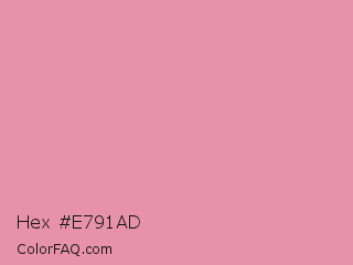 Hex #e791ad Color is a light rose color and the nearest color is Light Thulian Pink #e68fac. Hex code #e791ad and RGB value is rgb(231,145,173). In RGB color space, this color is composed of 91% red, 57% green, 68% blue, In CMYK color space, this color is composed of 0% cyan, 37% magenta, 25% yellow , 9% black , In HSL color space, this color has a hue angle of 340° , 64% saturation and 74% lightness.