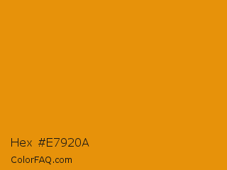 Hex #e7920a Color is a normal orange color and the nearest color is Gamboge #e49b0f. Hex code #e7920a and RGB value is rgb(231,146,10). In RGB color space, this color is composed of 91% red, 57% green, 4% blue, In CMYK color space, this color is composed of 0% cyan, 37% magenta, 96% yellow , 9% black , In HSL color space, this color has a hue angle of 37° , 92% saturation and 47% lightness.