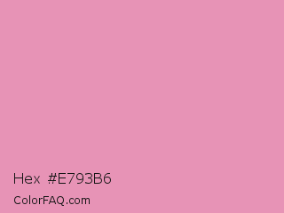Hex #e793b6 Color is a light rose color and the nearest color is Light Thulian Pink #e68fac. Hex code #e793b6 and RGB value is rgb(231,147,182). In RGB color space, this color is composed of 91% red, 58% green, 71% blue, In CMYK color space, this color is composed of 0% cyan, 36% magenta, 21% yellow , 9% black , In HSL color space, this color has a hue angle of 335° , 64% saturation and 74% lightness.