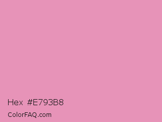 Hex #e793b8 Color is a light rose color and the nearest color is Shocking #e292c0. Hex code #e793b8 and RGB value is rgb(231,147,184). In RGB color space, this color is composed of 91% red, 58% green, 72% blue, In CMYK color space, this color is composed of 0% cyan, 36% magenta, 20% yellow , 9% black , In HSL color space, this color has a hue angle of 334° , 64% saturation and 74% lightness.