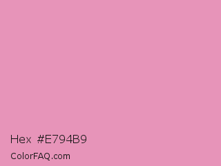 Hex #e794b9 Color is a light rose color and the nearest color is Shocking #e292c0. Hex code #e794b9 and RGB value is rgb(231,148,185). In RGB color space, this color is composed of 91% red, 58% green, 73% blue, In CMYK color space, this color is composed of 0% cyan, 36% magenta, 20% yellow , 9% black , In HSL color space, this color has a hue angle of 333° , 63% saturation and 74% lightness.