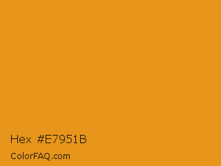 Hex #e7951b Color is a normal orange color and the nearest color is Dixie #e29418. Hex code #e7951b and RGB value is rgb(231,149,27). In RGB color space, this color is composed of 91% red, 58% green, 11% blue, In CMYK color space, this color is composed of 0% cyan, 35% magenta, 88% yellow , 9% black , In HSL color space, this color has a hue angle of 36° , 81% saturation and 51% lightness.