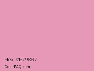 Hex #e798b7 Color is a light rose color and the nearest color is Amaranth Pink #f19cbb. Hex code #e798b7 and RGB value is rgb(231,152,183). In RGB color space, this color is composed of 91% red, 60% green, 72% blue, In CMYK color space, this color is composed of 0% cyan, 34% magenta, 21% yellow , 9% black , In HSL color space, this color has a hue angle of 336° , 62% saturation and 75% lightness.