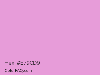 Hex #e79cd9 Color is a light magenta color and the nearest color is Light Orchid #e29cd2. Hex code #e79cd9 and RGB value is rgb(231,156,217). In RGB color space, this color is composed of 91% red, 61% green, 85% blue, In CMYK color space, this color is composed of 0% cyan, 32% magenta, 6% yellow , 9% black , In HSL color space, this color has a hue angle of 311° , 61% saturation and 76% lightness.