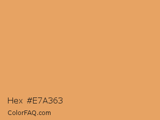 Hex #e7a363 Color is a light orange color and the nearest color is Earth Yellow #e1a95f. Hex code #e7a363 and RGB value is rgb(231,163,99). In RGB color space, this color is composed of 91% red, 64% green, 39% blue, In CMYK color space, this color is composed of 0% cyan, 29% magenta, 57% yellow , 9% black , In HSL color space, this color has a hue angle of 29° , 73% saturation and 65% lightness.