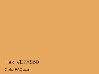 Hex #e7a860 Color is a light orange color and the nearest color is Earth Yellow #e1a95f. Hex code #e7a860 and RGB value is rgb(231,168,96). In RGB color space, this color is composed of 91% red, 66% green, 38% blue, In CMYK color space, this color is composed of 0% cyan, 27% magenta, 58% yellow , 9% black , In HSL color space, this color has a hue angle of 32° , 74% saturation and 64% lightness.