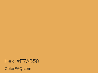 Hex #e7ab58 Color is a light orange color and the nearest color is Sunray #e3ab57. Hex code #e7ab58 and RGB value is rgb(231,171,88). In RGB color space, this color is composed of 91% red, 67% green, 35% blue, In CMYK color space, this color is composed of 0% cyan, 26% magenta, 62% yellow , 9% black , In HSL color space, this color has a hue angle of 35° , 75% saturation and 63% lightness.