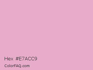 Hex #e7acc9 Color is a light rose color and the nearest color is Pink Pearl #e7accf. Hex code #e7acc9 and RGB value is rgb(231,172,201). In RGB color space, this color is composed of 91% red, 67% green, 79% blue, In CMYK color space, this color is composed of 0% cyan, 26% magenta, 13% yellow , 9% black , In HSL color space, this color has a hue angle of 331° , 55% saturation and 79% lightness.