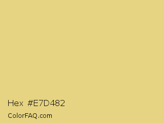 Hex #e7d482 Color is a light yellow color and the nearest color is Flax #eedc82. Hex code #e7d482 and RGB value is rgb(231,212,130). In RGB color space, this color is composed of 91% red, 83% green, 51% blue, In CMYK color space, this color is composed of 0% cyan, 8% magenta, 44% yellow , 9% black , In HSL color space, this color has a hue angle of 49° , 68% saturation and 71% lightness.