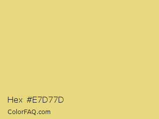 Hex #e7d77d Color is a light yellow color and the nearest color is Golden Sand #f0db7d. Hex code #e7d77d and RGB value is rgb(231,215,125). In RGB color space, this color is composed of 91% red, 84% green, 49% blue, In CMYK color space, this color is composed of 0% cyan, 7% magenta, 46% yellow , 9% black , In HSL color space, this color has a hue angle of 51° , 69% saturation and 70% lightness.