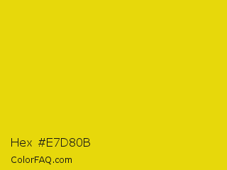 Hex #e7d80b Color is a normal yellow color and the nearest color is Citrine #e4d00a. Hex code #e7d80b and RGB value is rgb(231,216,11). In RGB color space, this color is composed of 91% red, 85% green, 4% blue, In CMYK color space, this color is composed of 0% cyan, 6% magenta, 95% yellow , 9% black , In HSL color space, this color has a hue angle of 56° , 91% saturation and 47% lightness.