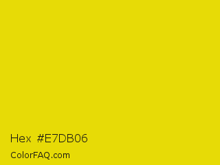 Hex #e7db06 Color is a normal yellow color and the nearest color is Peridot #e6e200. Hex code #e7db06 and RGB value is rgb(231,219,6). In RGB color space, this color is composed of 91% red, 86% green, 2% blue, In CMYK color space, this color is composed of 0% cyan, 5% magenta, 97% yellow , 9% black , In HSL color space, this color has a hue angle of 57° , 95% saturation and 46% lightness.