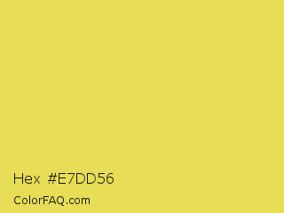 Hex #e7dd56 Color is a light yellow color and the nearest color is Confetti #e9d75a. Hex code #e7dd56 and RGB value is rgb(231,221,86). In RGB color space, this color is composed of 91% red, 87% green, 34% blue, In CMYK color space, this color is composed of 0% cyan, 4% magenta, 63% yellow , 9% black , In HSL color space, this color has a hue angle of 56° , 75% saturation and 62% lightness.