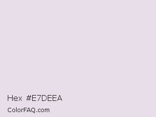 Hex #e7deea Color is a very light purple color and the nearest color is Snuff #e2d8ed. Hex code #e7deea and RGB value is rgb(231,222,234). In RGB color space, this color is composed of 91% red, 87% green, 92% blue, In CMYK color space, this color is composed of 1% cyan, 5% magenta, 0% yellow , 8% black , In HSL color space, this color has a hue angle of 285° , 22% saturation and 89% lightness.
