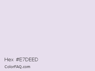 Hex #e7deed Color is a very light purple color and the nearest color is Snuff #e2d8ed. Hex code #e7deed and RGB value is rgb(231,222,237). In RGB color space, this color is composed of 91% red, 87% green, 93% blue, In CMYK color space, this color is composed of 3% cyan, 6% magenta, 0% yellow , 7% black , In HSL color space, this color has a hue angle of 276° , 29% saturation and 90% lightness.