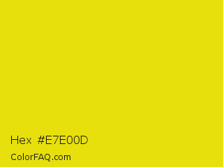 Hex #e7e00d Color is a normal yellow color and the nearest color is Piss Yellow #e1e115. Hex code #e7e00d and RGB value is rgb(231,224,13). In RGB color space, this color is composed of 91% red, 88% green, 5% blue, In CMYK color space, this color is composed of 0% cyan, 3% magenta, 94% yellow , 9% black , In HSL color space, this color has a hue angle of 58° , 89% saturation and 48% lightness.