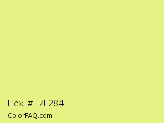 Hex #e7f284 Color is a light yellow color and the nearest color is Key Lime #e8f48c. Hex code #e7f284 and RGB value is rgb(231,242,132). In RGB color space, this color is composed of 91% red, 95% green, 52% blue, In CMYK color space, this color is composed of 5% cyan, 0% magenta, 45% yellow , 5% black , In HSL color space, this color has a hue angle of 66° , 81% saturation and 73% lightness.