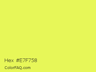 Hex #e7f758 Color is a light yellow color and the nearest color is Canary #f3fb62. Hex code #e7f758 and RGB value is rgb(231,247,88). In RGB color space, this color is composed of 91% red, 97% green, 35% blue, In CMYK color space, this color is composed of 6% cyan, 0% magenta, 64% yellow , 3% black , In HSL color space, this color has a hue angle of 66° , 91% saturation and 66% lightness.