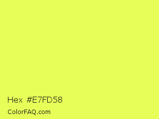 Hex #e7fd58 Color is a light yellow color and the nearest color is Canary #f3fb62. Hex code #e7fd58 and RGB value is rgb(231,253,88). In RGB color space, this color is composed of 91% red, 99% green, 35% blue, In CMYK color space, this color is composed of 9% cyan, 0% magenta, 65% yellow , 1% black , In HSL color space, this color has a hue angle of 68° , 98% saturation and 67% lightness.