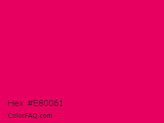 Hex #e80061 Color is a normal rose color and the nearest color is Raspberry #e30b5d. Hex code #e80061 and RGB value is rgb(232,0,97). In RGB color space, this color is composed of 91% red, 0% green, 38% blue, In CMYK color space, this color is composed of 0% cyan, 100% magenta, 58% yellow , 9% black , In HSL color space, this color has a hue angle of 335° , 100% saturation and 45% lightness.