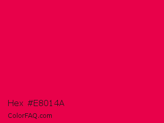 Hex #e8014a Color is a normal rose color and the nearest color is Red Ribbon #ed0a3f. Hex code #e8014a and RGB value is rgb(232,1,74). In RGB color space, this color is composed of 91% red, 0% green, 29% blue, In CMYK color space, this color is composed of 0% cyan, 100% magenta, 68% yellow , 9% black , In HSL color space, this color has a hue angle of 341° , 99% saturation and 46% lightness.