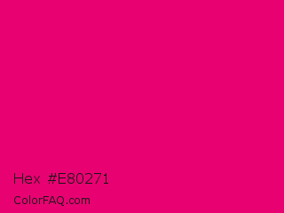 Hex #e80271 Color is a normal rose color and the nearest color is Red Purple #e40078. Hex code #e80271 and RGB value is rgb(232,2,113). In RGB color space, this color is composed of 91% red, 1% green, 44% blue, In CMYK color space, this color is composed of 0% cyan, 99% magenta, 51% yellow , 9% black , In HSL color space, this color has a hue angle of 331° , 98% saturation and 46% lightness.