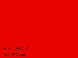 Hex #e80501 Color is a normal red color and the nearest color is KU Crimson #e8000d. Hex code #e80501 and RGB value is rgb(232,5,1). In RGB color space, this color is composed of 91% red, 2% green, 0% blue, In CMYK color space, this color is composed of 0% cyan, 98% magenta, 100% yellow , 9% black , In HSL color space, this color has a hue angle of 1° , 99% saturation and 46% lightness.