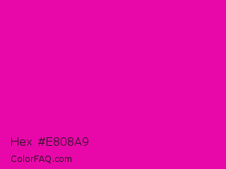Hex #e808a9 Color is a normal magenta color and the nearest color is Hollywood Cerise #f400a1. Hex code #e808a9 and RGB value is rgb(232,8,169). In RGB color space, this color is composed of 91% red, 3% green, 66% blue, In CMYK color space, this color is composed of 0% cyan, 97% magenta, 27% yellow , 9% black , In HSL color space, this color has a hue angle of 317° , 93% saturation and 47% lightness.