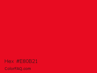 Hex #e80b21 Color is a normal red color and the nearest color is Cadmium Red #e30022. Hex code #e80b21 and RGB value is rgb(232,11,33). In RGB color space, this color is composed of 91% red, 4% green, 13% blue, In CMYK color space, this color is composed of 0% cyan, 95% magenta, 86% yellow , 9% black , In HSL color space, this color has a hue angle of 354° , 91% saturation and 48% lightness.