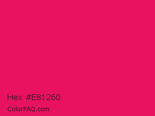 Hex #e81260 Color is a normal rose color and the nearest color is Ruby #e0115f. Hex code #e81260 and RGB value is rgb(232,18,96). In RGB color space, this color is composed of 91% red, 7% green, 38% blue, In CMYK color space, this color is composed of 0% cyan, 92% magenta, 59% yellow , 9% black , In HSL color space, this color has a hue angle of 338° , 86% saturation and 49% lightness.