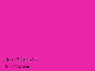 Hex #e825a7 Color is a normal magenta color and the nearest color is Frostbite #e936a7. Hex code #e825a7 and RGB value is rgb(232,37,167). In RGB color space, this color is composed of 91% red, 15% green, 65% blue, In CMYK color space, this color is composed of 0% cyan, 84% magenta, 28% yellow , 9% black , In HSL color space, this color has a hue angle of 320° , 81% saturation and 53% lightness.