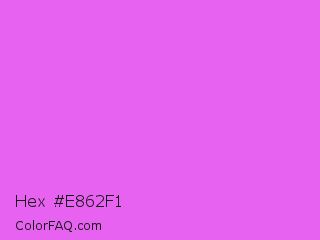 Hex #e862f1 Color is a light magenta color and the nearest color is Heliotrope #df73ff. Hex code #e862f1 and RGB value is rgb(232,98,241). In RGB color space, this color is composed of 91% red, 38% green, 95% blue, In CMYK color space, this color is composed of 4% cyan, 59% magenta, 0% yellow , 5% black , In HSL color space, this color has a hue angle of 296° , 84% saturation and 66% lightness.