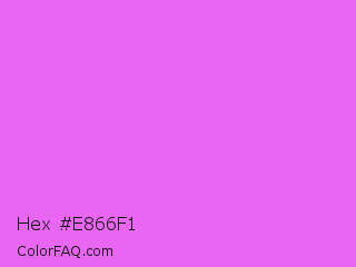 Hex #e866f1 Color is a light magenta color and the nearest color is Heliotrope #df73ff. Hex code #e866f1 and RGB value is rgb(232,102,241). In RGB color space, this color is composed of 91% red, 40% green, 95% blue, In CMYK color space, this color is composed of 4% cyan, 58% magenta, 0% yellow , 5% black , In HSL color space, this color has a hue angle of 296° , 83% saturation and 67% lightness.